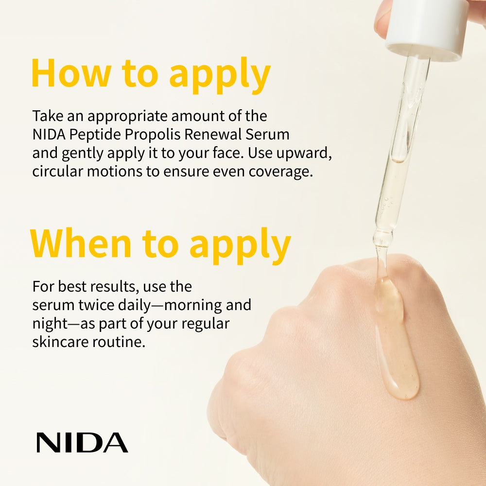 Take an appropriate amount of the NIDA Peptide Propolis Renewal Serum and gently apply to face and neck using upward, circular motions to ensure even coverage.